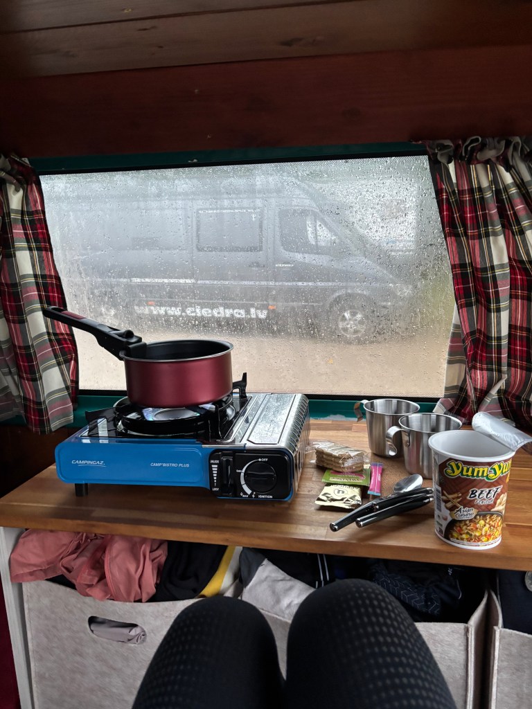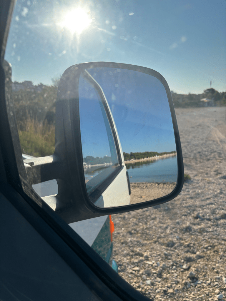 Nous avons finalement passé une petite nuit dans un spot caché, non loin d’une plage — où l’on a même pu rouler avec le van, oui oui ! Au matin, on sort le van de sa cachette et on prend le petit déjeuner les pieds dans le sable. La journée commence doucement, face à la mer… et elle commence vraiment bien 🥰