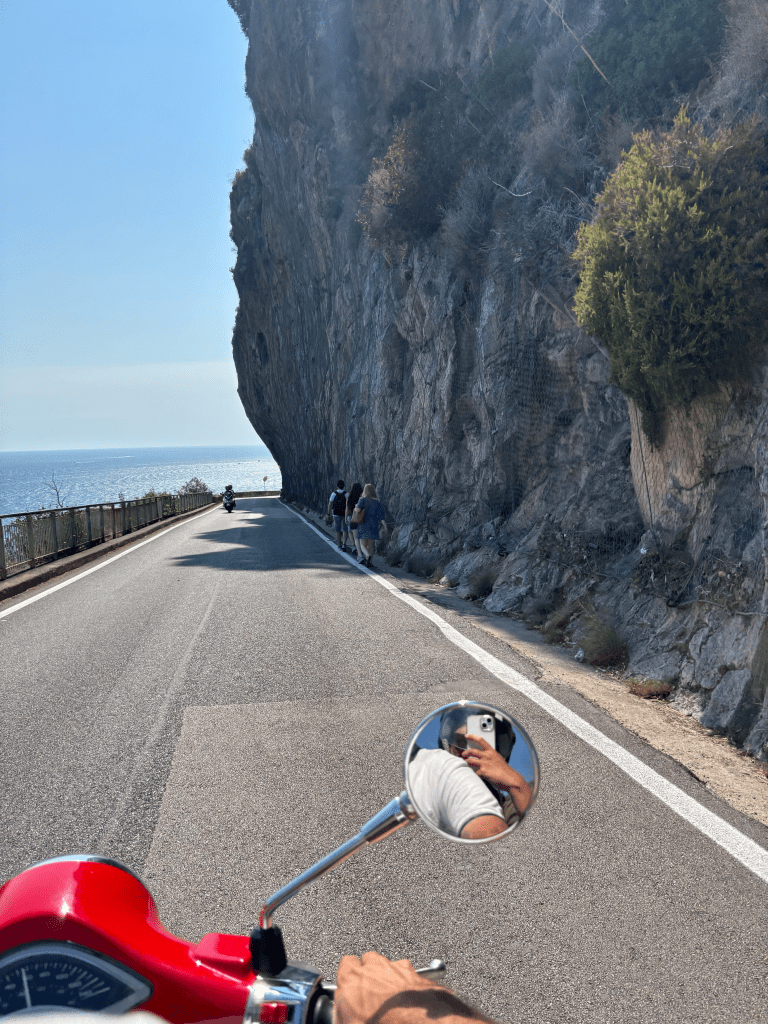 Quelques virages plus tard — beaucoup de virages même — nous voilà à Furore, chez Amalfi Coast Rent, pour 80€ la journée (prix été 2025). La petite route est déjà bien encombrée, ce qui confirme rapidement que le van n’aurait clairement pas été l’option idéale.