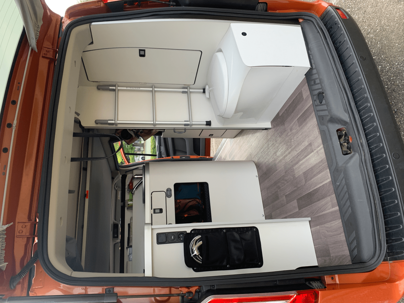Ensuite, l’aménagement Westfalia. Une valeur sûre. Mais surtout, une vraie différence face à son cousin Volkswagen : ici, les espaces sont distincts. Une salle à manger séparée de la cuisine et de la salle de bain. Résultat ? Une vraie sensation d’espace, même dans un format contenu.