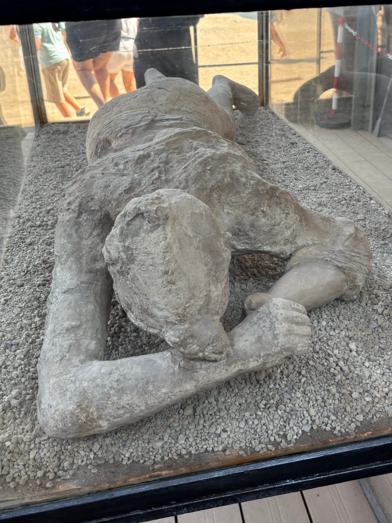 À Pompéi, ce qui m’a le plus marquée, ce sont les moulages de corps. Ils rendent l’histoire incroyablement réelle. Sous plusieurs mètres de cendres, les corps se sont décomposés avec le temps, laissant des vides que les archéologues ont remplis de plâtre au XIXᵉ siècle. Le résultat est incroyable ! On les voit des humains figés dans leur fuite, surpris par les cendres et les gaz du Vésuve.