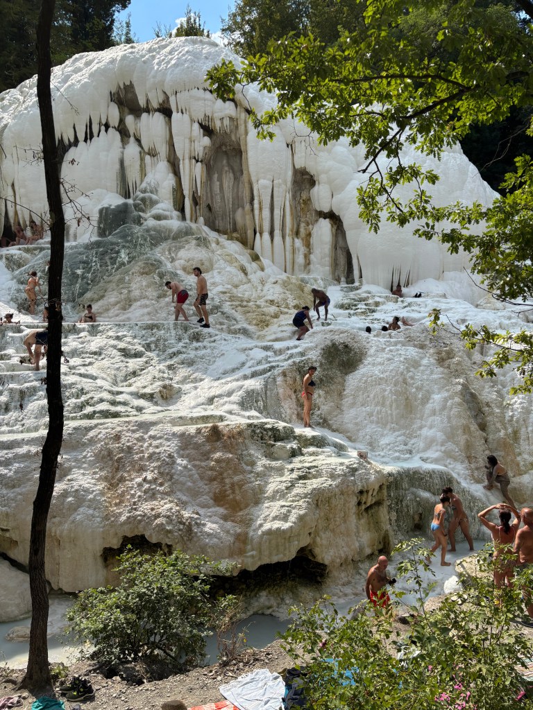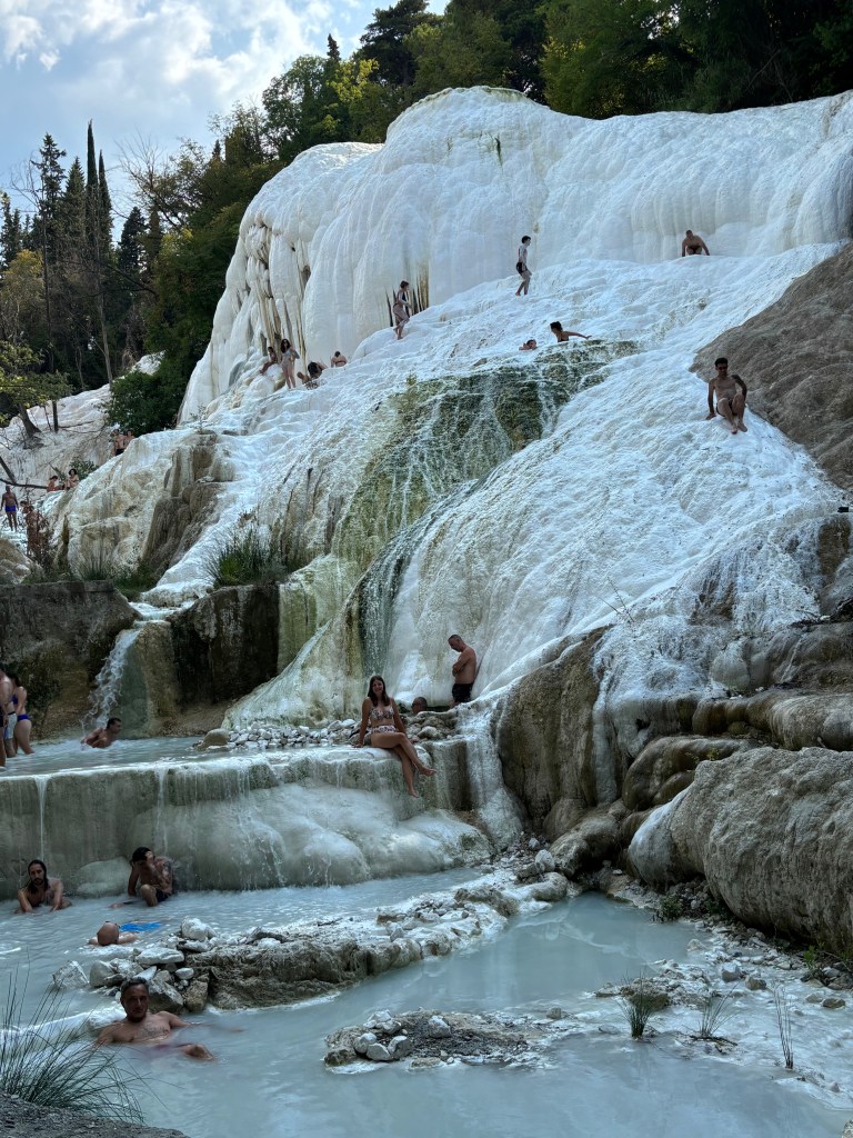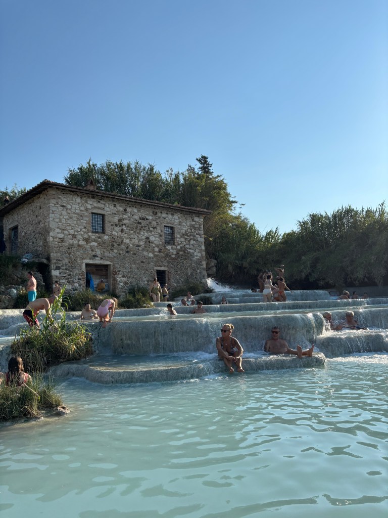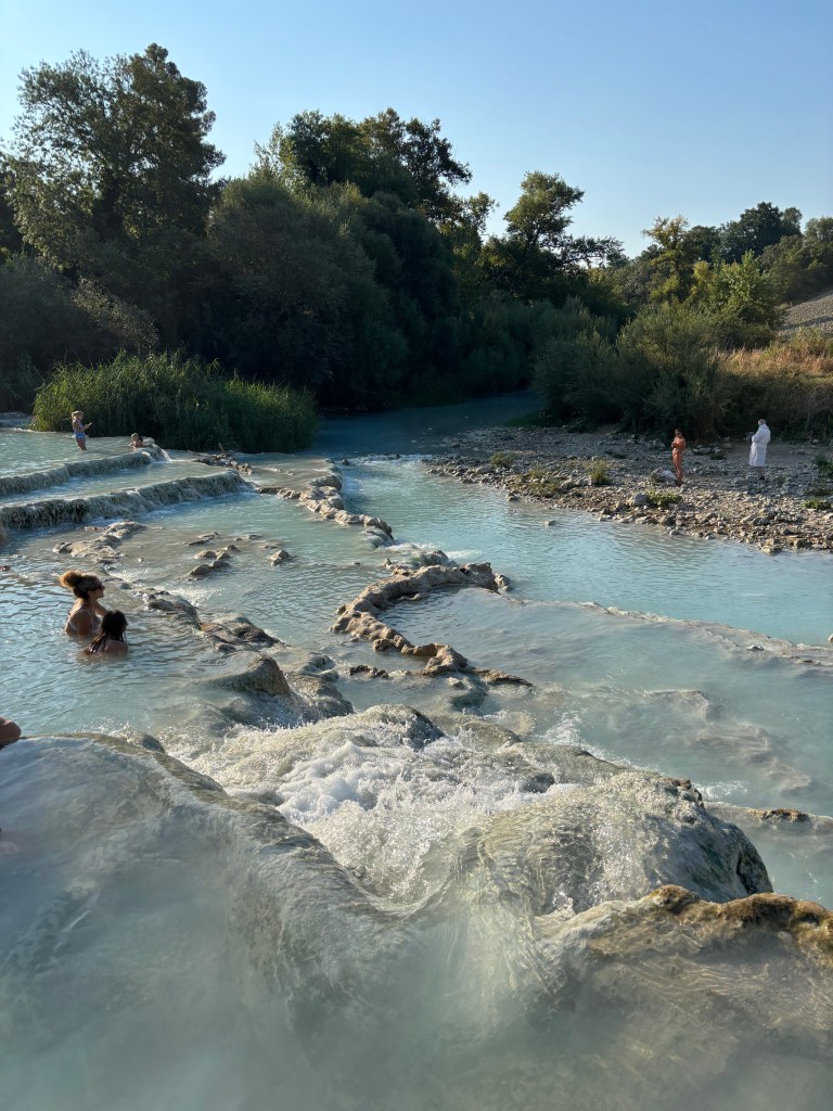 Notre deuxième arrêt se fait aux sources chaudes de Bagni San Filippo en fin d’après-midi, et cette fois, sans les petites larves rouges que nous avions vues aux Cascate del Mulino. Certains visiteurs escaladent les cascades, d’autres se prélassent dans de petits bassins naturels en hauteur, un endroit absolument sublime sous les arbres, une atmosphère paisible. Une belle pause avant de reprendre la route.